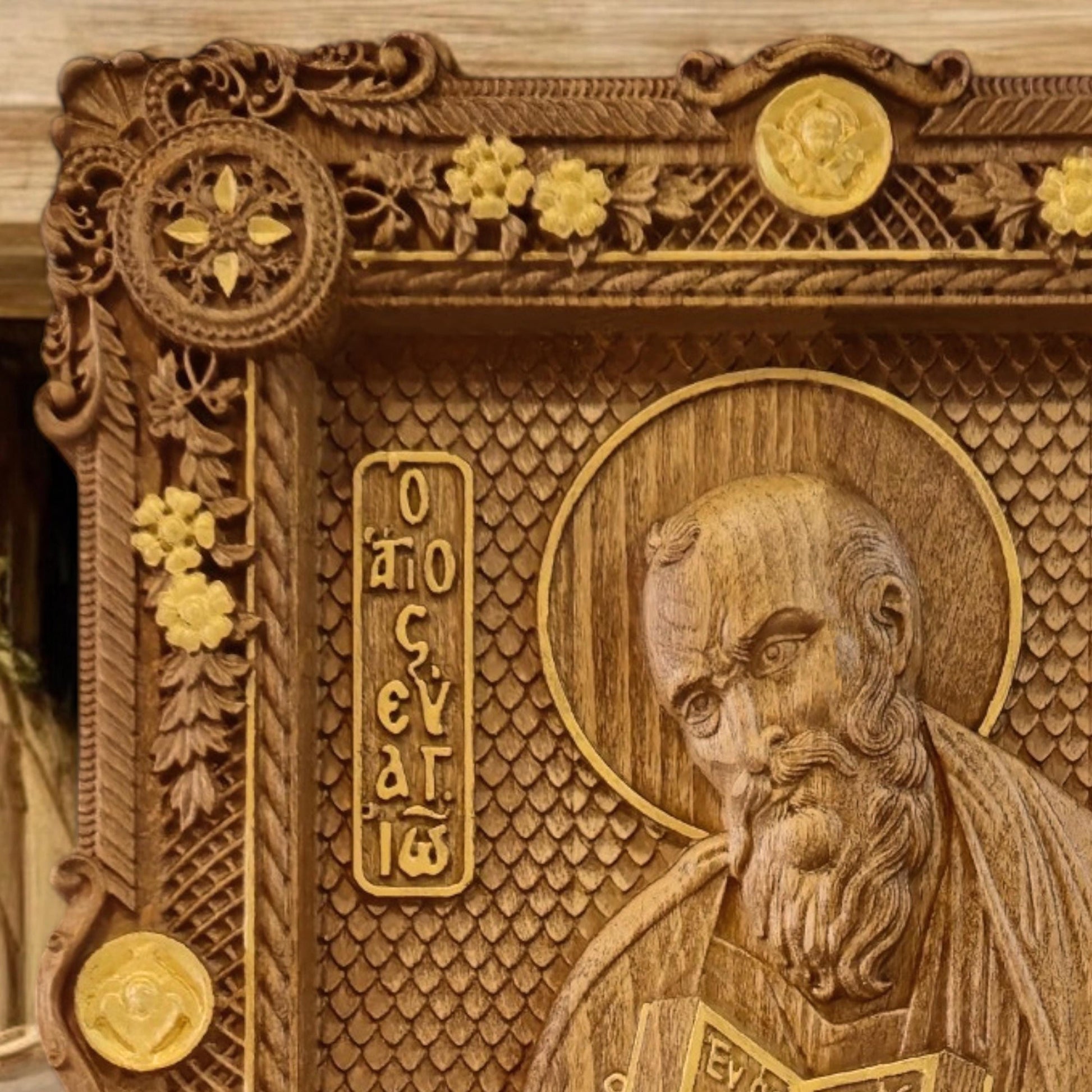 Saint John the Theologian Wooden Carved Handcrafted Christian Religious Icon. Byzantine Home Wall Art Decor Gift. Orthodox Greek Woodcarving Sculpture.