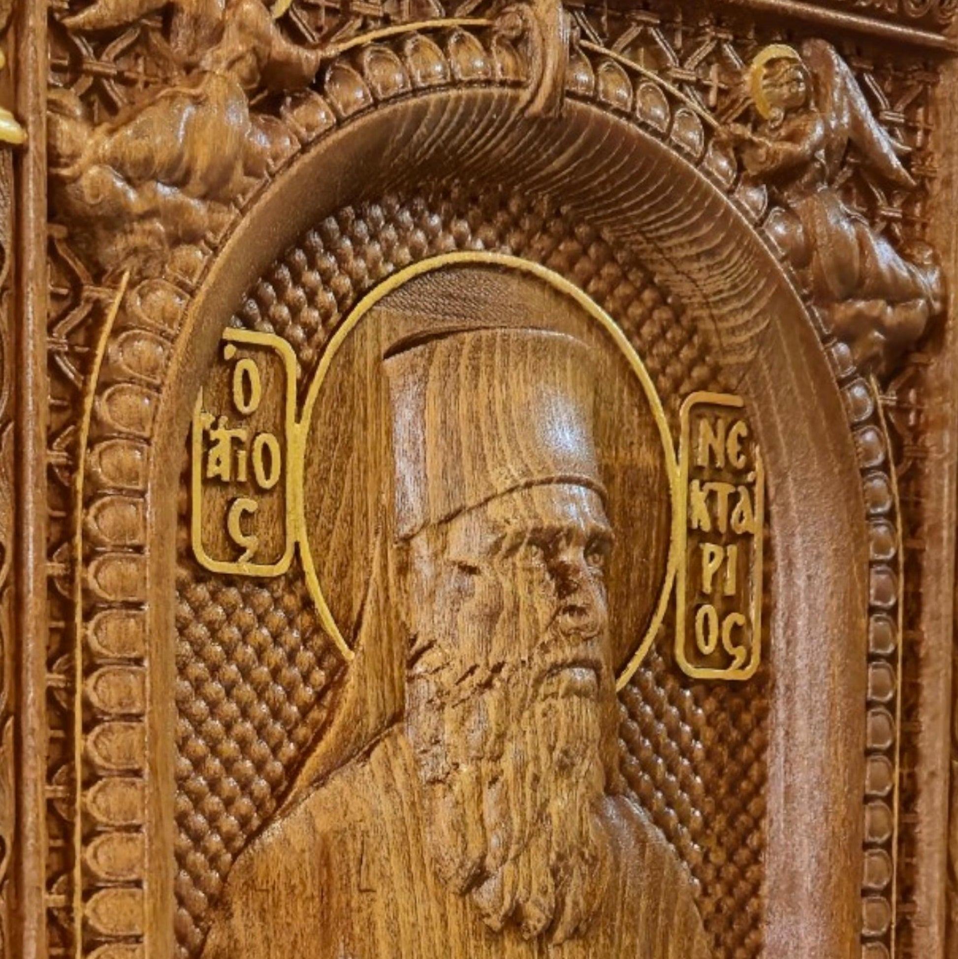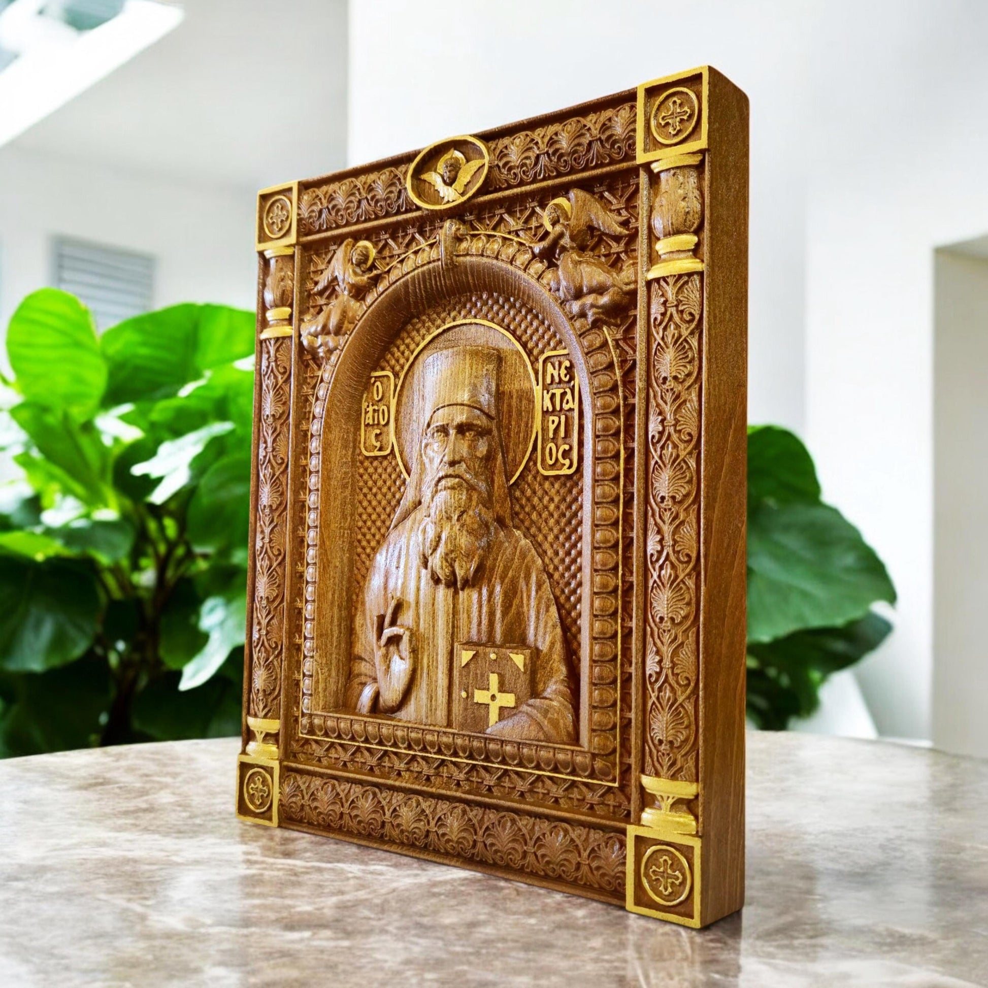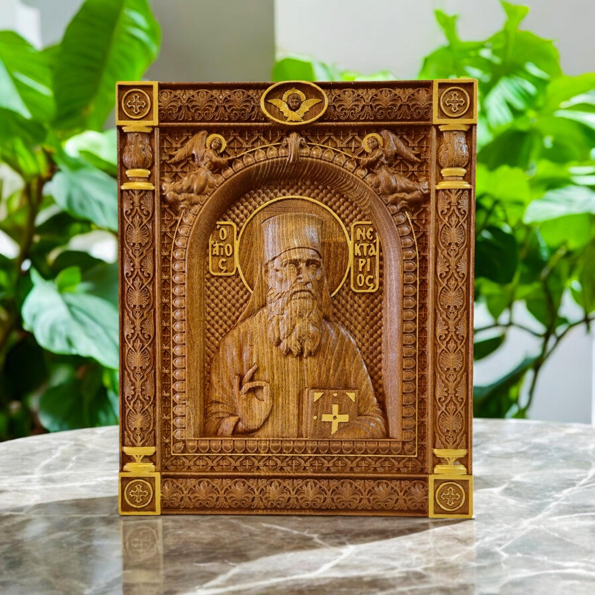 Saint Nectarios of Aegina Wooden Carved Handcrafted Christian Religious Icon. Byzantine Home Wall Art Decor Gift. Orthodox Greek Woodcarving Sculpture.