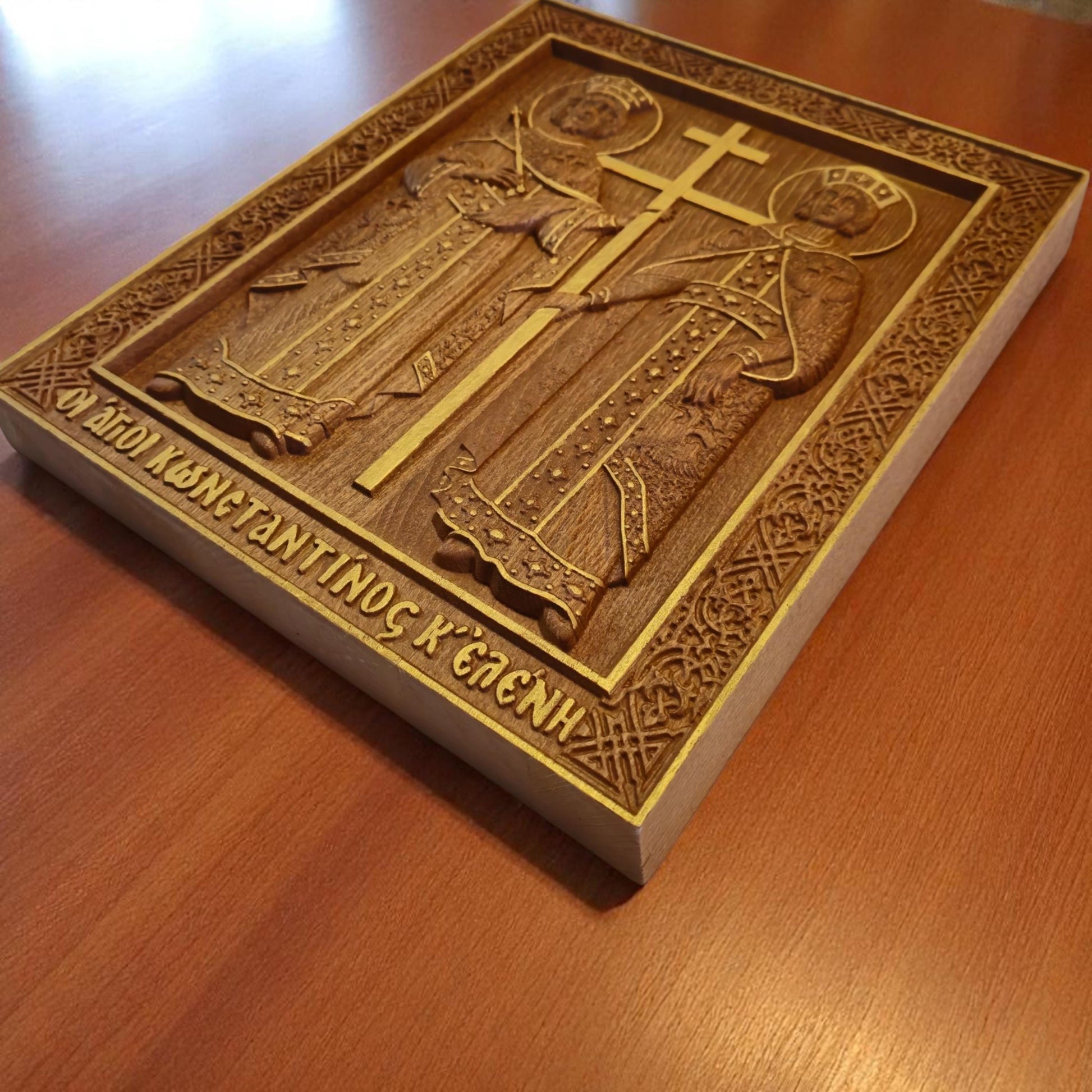 Saints Constantine and Helena Wooden Carved Handcrafted Christian Religious Icon. Byzantine Home Wall Art Decor Gift. Orthodox Greek Woodcarving Sculpture.