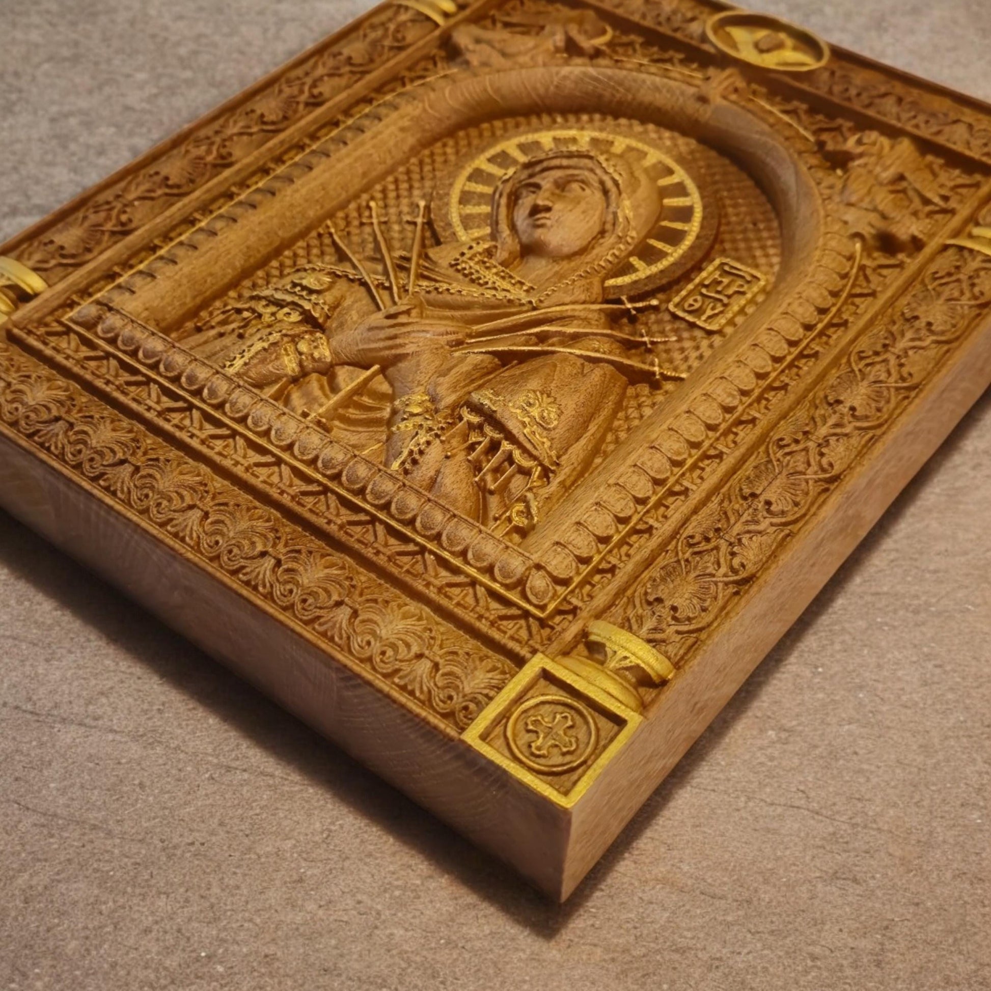 Virgin Mary of the Seven Swords Wooden Carved Handcrafted Christian Religious Icon. Byzantine Home Wall Art Decor Gift. Orthodox Greek Woodcarving Sculpture.
