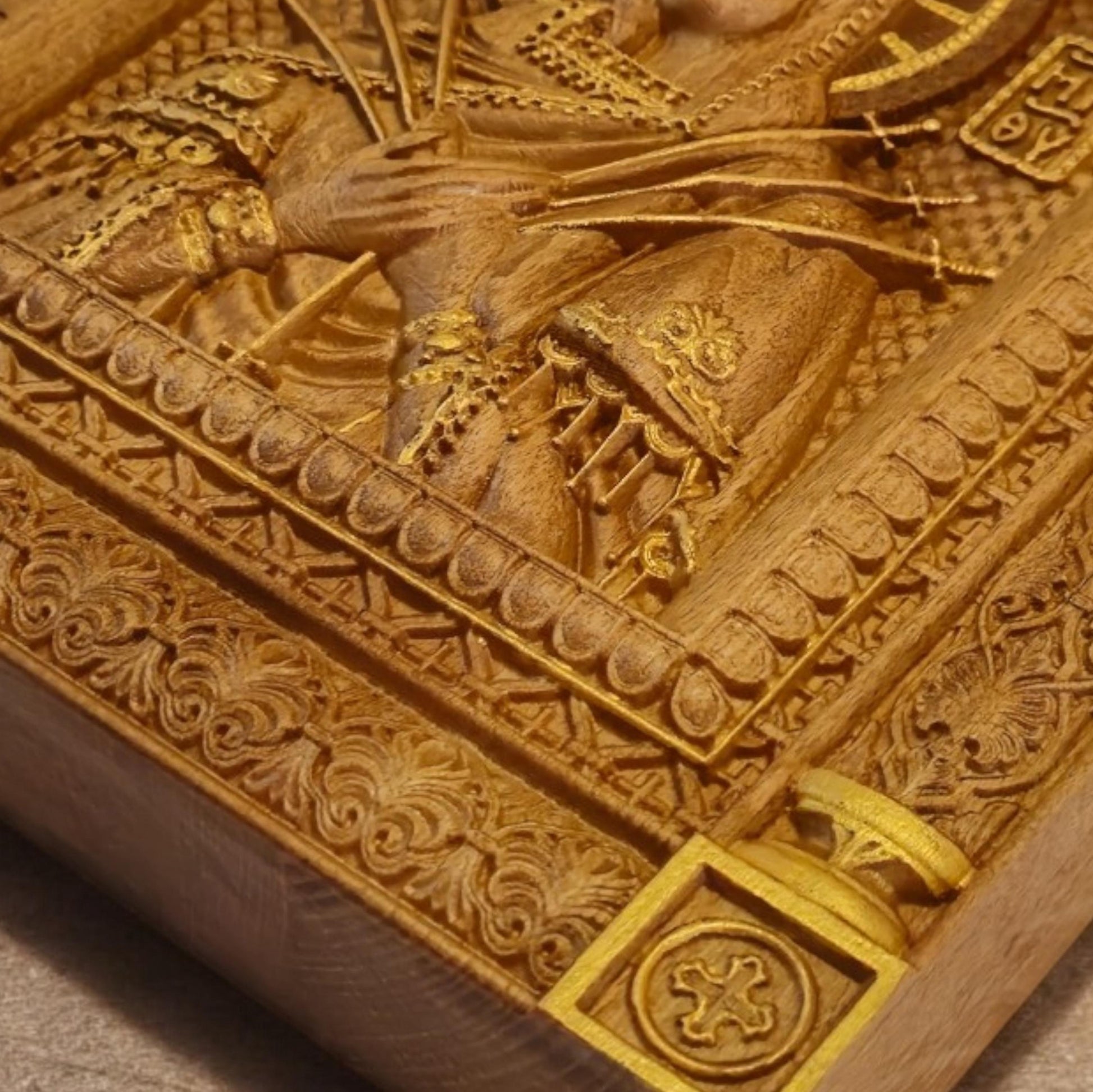 MANUFACTURING PROCESS This Icon is made from high quality natural solid Linden wood. The Icon’s manufacturing involve computer processing technology with manual tuning and is finished by hand with environmentally friendly water-based paints and beeswax. Golden highlights are painted by hand, if chosen.